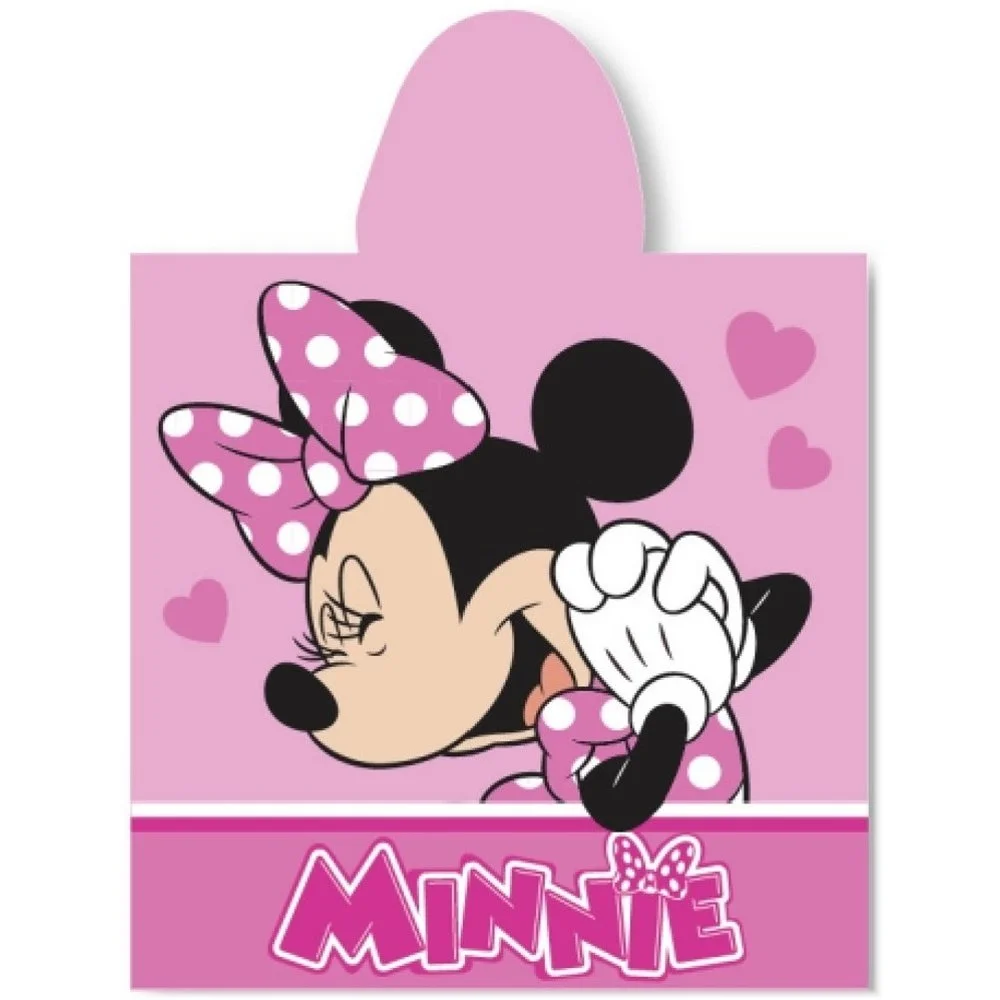 Dětské koupací pončo s kapucí a motivem Minnie Mouse - růžové se srdíčky. Vyrobeno ze 100% bavlněného froté s gramáží 320 g/m². Rozměry 55 × 110 cm, ideální k vodě i po koupeli.