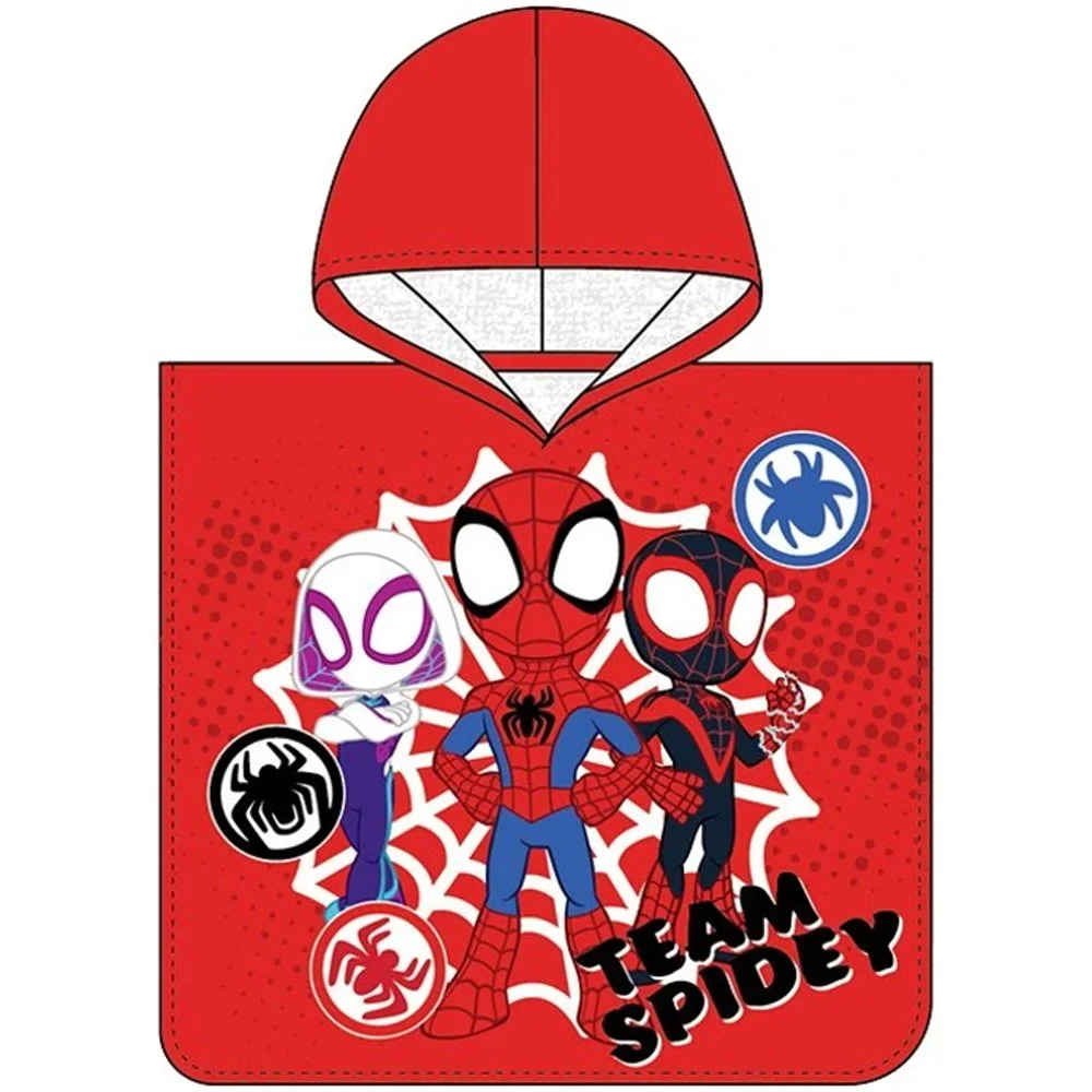 Dětské koupací pončo Spidey – motiv Tým malých hrdinů. Vyrobeno ze 100% bavlny s gramáží 300 g/m², rozměr 50 × 115 cm. Červené pončo s kapucí zdobí postavičky Spideyho, Ghost-Spider a Milese Moralese, známé z animovaného seriálu Spidey a jeho úžasní přátelé. Vhodné pro děti od 3 do 6 let.