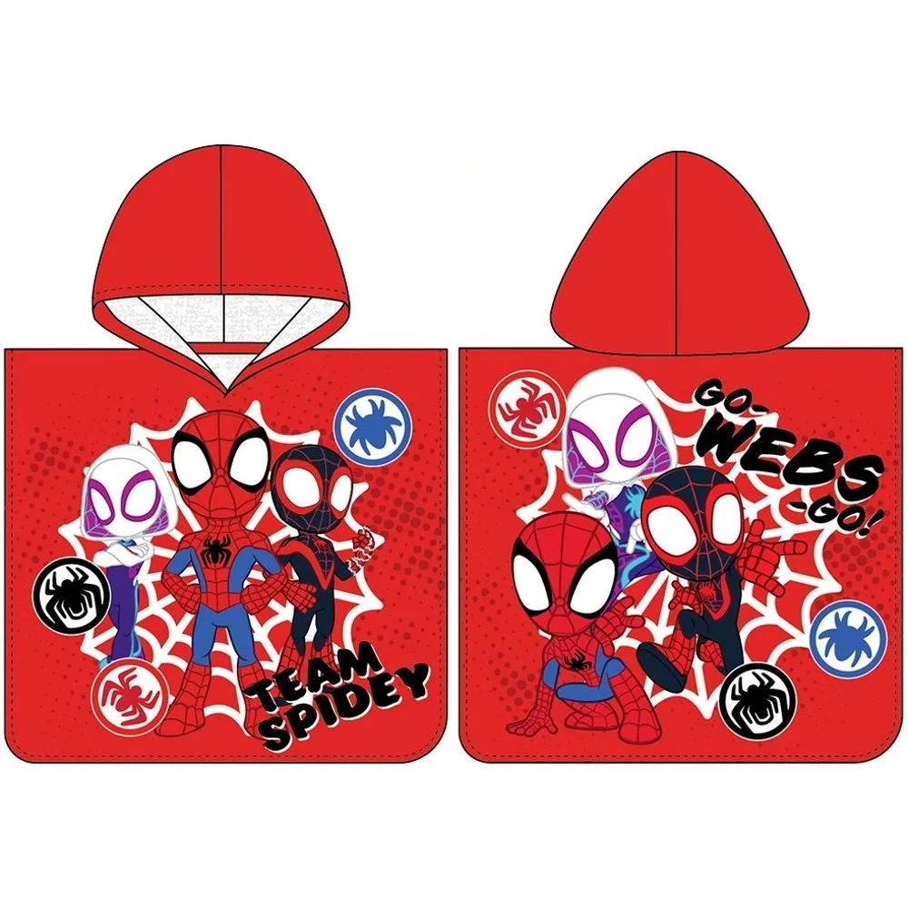 Více o produktuDětské pončo s kapucí s motivem Spideyho a jeho úžasných přátel potěší všechny malé fanoušky pavoučích hrdinů. Pončo na přední straně zdobí Spidey, Ghost-Spider a Miles Morales s nápisem „Team Spidey“, na zadní straně pak trojice hrdinů v akci a výrazné heslo „Go Webs Go!“. Veselý design s pavučinovým pozadím je ideální na pláž, k bazénu i po koupeli doma.