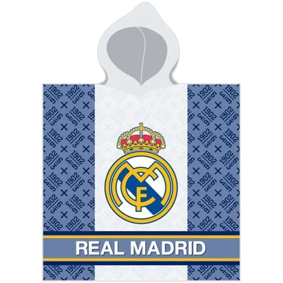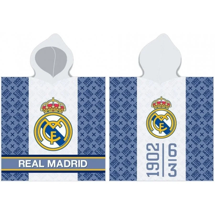Plážová bavlněná osuška s kapucí / chlapecké pončo FC Real Madrid - vyrobené z příjemně jemného a dobře savého 100% bavlněného froté. Přední stranu osušky zdobí logo fotbalového mančaftu Real Madrid, zadní stranu datum jeho založení 6.3.1902. Rozměry tohoto ponča pro malé fotbalové fanoušky RMCF jsou 60 x 120 cm (60 x 60 cm přední díl a 60 x 60 cm zadní díl).