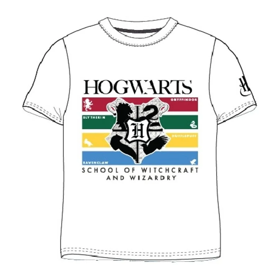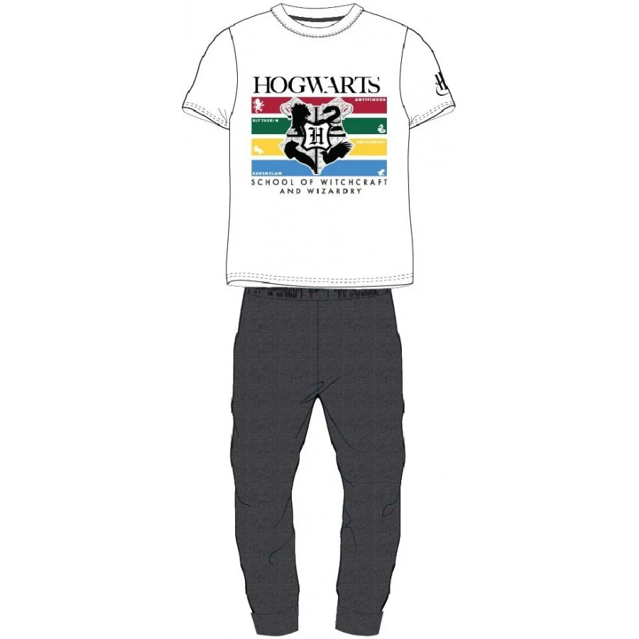 Pánské pyžamo Harry Potter - licenční motiv Hogwarts School of witchcraft and wizardry - s krátkým rukávem horního dílu a dlouhými nohavicemi ukončenými lemem. Horní díl zdobí erb školy čar a kouzel v Bradavicích na bílém podkladu. Je vyrobený ze 100% bavlny. Spodní díl je jednobarevný - šedý - a je vyrobený z bavlny s příměsí 10% polyesteru.