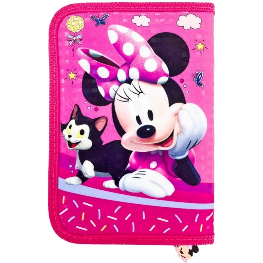 Pouzdro na školní potřeby Disney - Minnie Mouse - motiv s myškou Minnie a kačenkou Daisy z jedné strany a s Minnie a kotětem Figaro z druhé strany. Tento školní penál je vybaven klasickými gumovými úchyty na tužky, pastelky, nebo fixy i širšími úchyty na pravítko, gumu, nebo ořezávátko. Dále je vybaven dvěmi klopnami s průhlednou fólií na rozvrh hodin či jiné poznámky. Zapínání penálu je na zip.