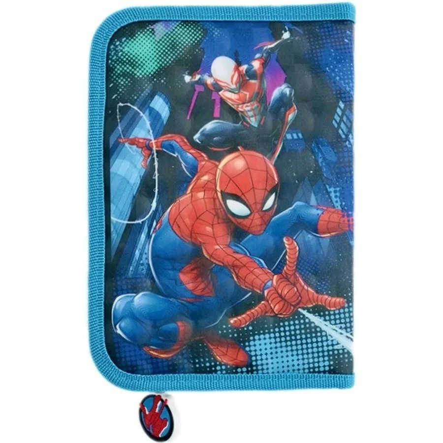 Pouzdro na školní potřeby Spiderman. Tento školní penál je vybaven klasickými gumovými úchyty na tužky, pastelky, nebo fixy i širšími úchyty na pravítko, gumu, nebo ořezávátko. Dále je vybaven dvěmi klopnami s průhlednou fólií na rozvrh hodin či jiné poznámky. Zapínání penálu je na zip.