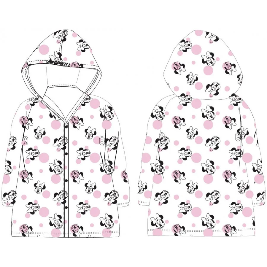 Dětská pláštěnka Disney - Minnie Mouse. Je vyrobena z měkkého, ale přesto pevného PVC. Má zapínání na druky a větrání v podpaží. Zdobí ji potréty oblíbené myšky Minnie a růžové puntíky na průhledném podkladu. Tuto pláštěnku pro holky dodáváme ve velikostech 104/110, 116/122, nebo 128/134.