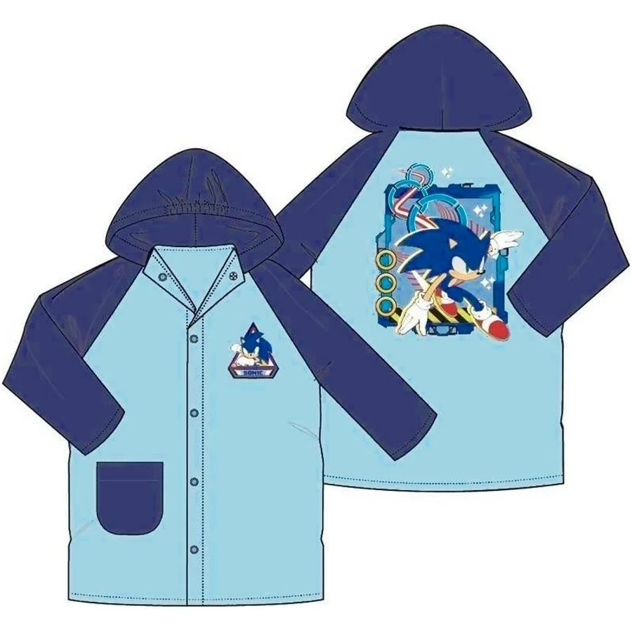 Dětská pláštěnka Ježek Sonic. Z přední i zadní strany ji zdobí obrázek ježka Soníka. Je vyrobena z měkkého, ale přesto pevného PVC, se zapínáním na druky. Tuto dětskou pláštěnku dodáváme ve velikostech 104, 116, 128 nebo 140 s tmavě modrou kapucí, kapsou a rukávy a světlejší, či tmavší modrou zbývající části pláštěnky.