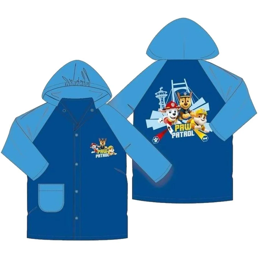 Dětská pláštěnka Tlapková patrola pro kluky. Z přední i zadní strany ji zdobí obrázek štěňat Chase, Marshalla a Rubble. Je vyrobena z měkkého, ale přesto pevného PVC, se zapínáním na druky. Tuto chlapeckou pláštěnku Paw Patrol dodáváme ve velikostech 98, 104, 110, nebo 116 a ve dvou barevných kombinacích se světle modrou kapucí a rukávy, nebo tmavě modrou kapucí a rukávy a k tomu vždy opačným odstínem barvy zbývající části.