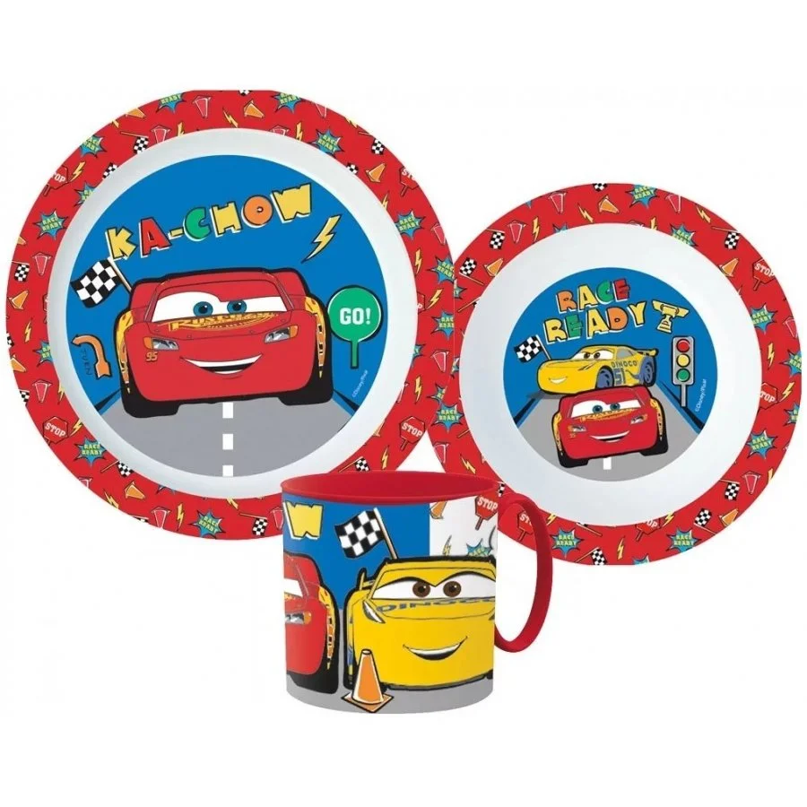 Dětská plastová jídelní sada s hrnečkem Auta - Cars. Potěší všechny obdivovatele závoďáků Bleska McQueen a Cruz Ramirezové, kterým bude z těchto talířků jistě více chutnat. Tato 3-dílná sada je vyrobena z ekologického recyklovaného a zdravotně nezávadného materiálu bez obsahu BPA. Obsahuje mělký talířek 19,5 x 2 cm, hlubší misku 12,6 x 5 cm a hrnek 265 ml. Eco friendly, baleno zvlášť, bez kartonového obalu.