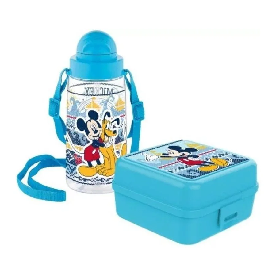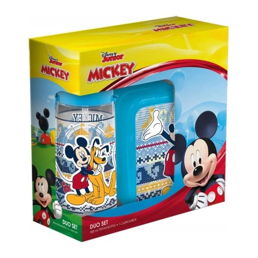Dětský set s krabičkou na svačinu a lahví na pití Mickey Mouse - Disney. Svačinový box má objem 1l. Spodní díl je rozdělen na 3 přihrádky a od horního dílu ho lze oddělit ještě víčkem. Láhev na pití má obsah 500ml a je vyrobena z lehkého, ale velmi odolného materiálu Tritan. Pod víčkem se skrývá silikonové brčko. Celá sada je vyrobena ze zdravotně nezávadného materiálu bez obsahu BPA a je zabalena v kartonové krabici. Je vhodná pro děti od 3 let.