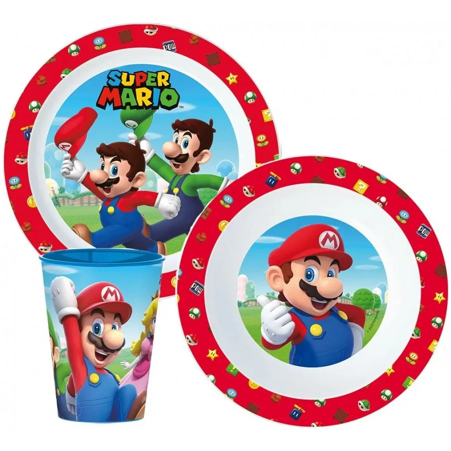 Plastová jídelní souprava s kelímkem pro děti Super Mario. Potěší všechny hráče plošinových her Nintendo, kterým bude z těchto talířků jistě více chutnat. Je vyrobena z ekologického recyklovaného a zdravotně nezávadného materiálu bez obsahu BPA. Obsahuje mělký talířek 19,5 x 2 cm, hlubší misku 12,6 x 5 cm a kelímek 260 ml. Eco friendly, baleno zvlášť, bez kartonového obalu. Toto nádobí nelze mýt v myčce na nádobí. K čištění nepoužívejte abraziva a detergenty. Lze jej používat v mikrovlnné troubě max. 2 minuty.