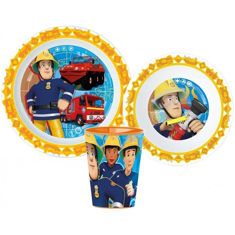 Plastová jídelní souprava s kelímkem pro děti Hasič Sam. Potěší všechny fanoušky Požárníka Sama a jeho týmu, kterým bude z těchto talířků jistě více chutnat. Je vyrobena z ekologického recyklovaného a zdravotně nezávadného materiálu bez obsahu BPA. Obsahuje mělký talířek 19,5 x 2 cm, hlubší misku 12,6 x 5 cm a kelímek 260 ml. Eco friendly, baleno zvlášť, bez kartonového obalu. Toto nádobí nelze mýt v myčce na nádobí. K čištění nepoužívejte abraziva a detergenty. Lze jej používat v mikrovlnné troubě max. 2 minuty.