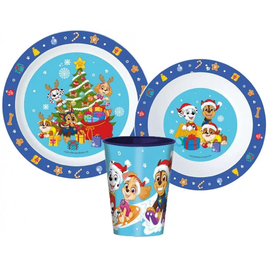 Dětská plastová jídelní sada Tlapková patrola o Vánocích - Paw Patrol. Potěší všechny malé kamarády party "tlapek", kterým bude z těchto talířků jistě více chutnat. Je vyrobena z ekologického recyklovaného a zdravotně nezávadného materiálu bez obsahu BPA. Obsahuje mělký talířek 19,5 x 2 cm, hlubší misku 12,6 x 5 cm a kelímek 260 ml. Eco friendly, baleno zvlášť, bez kartonového obalu. Nádobí nelze mýt v myčce na nádobí. K čištění nepoužívejte abraziva a detergenty. Lze jej používat v mikrovlnné troubě při výkonu do 600W max. 2 minuty.