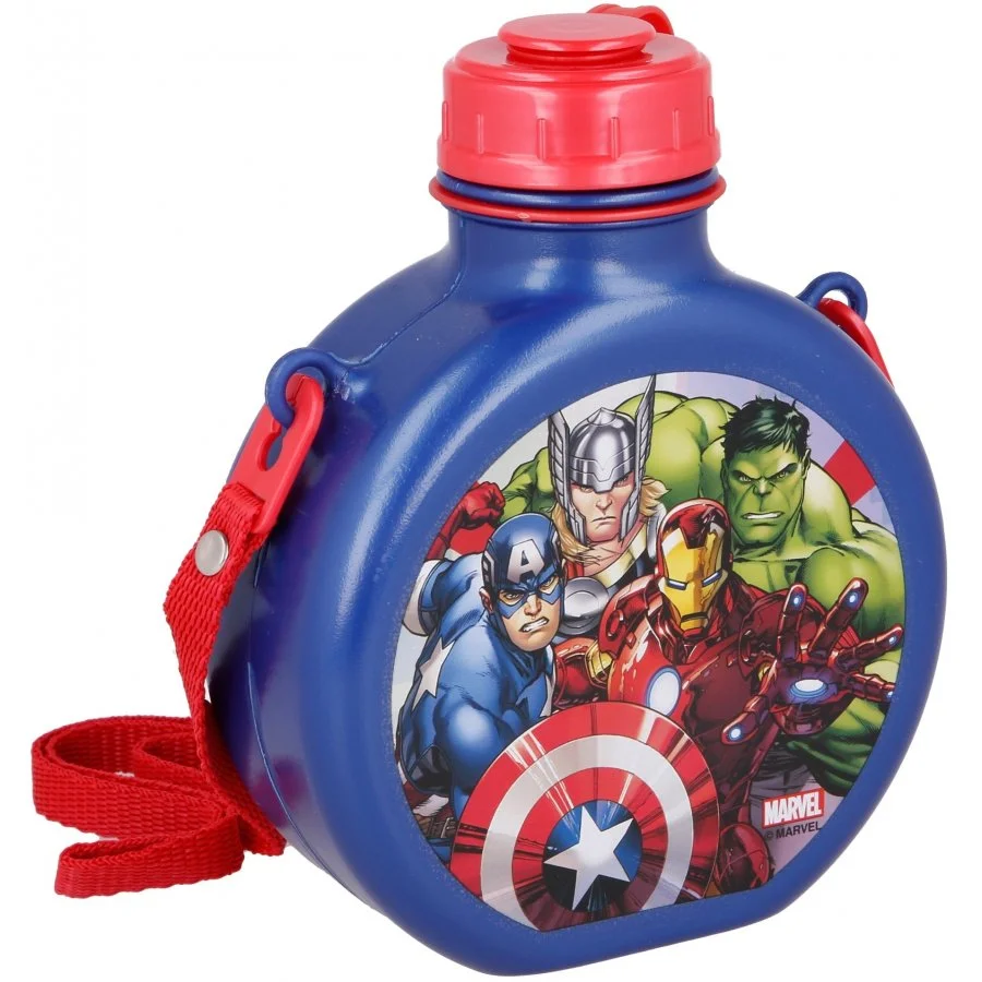 Dětská láhev na pití Avengers - MARVEL. Je vyrobena z odolného a zdravotně nezávadného plastu bez obsahu BPA. Má praktický šroubovací uzávěr a popruh přes rameno. Není vhodná do myčky na nádobí, ani do mikrovlnné trouby. K čištění nepoužívejte ani abraziva a ... Celý text