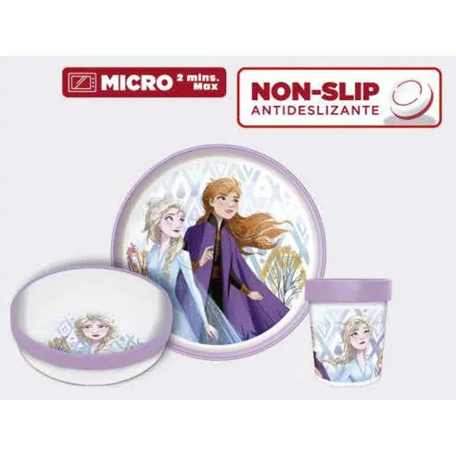 Třídílná dětská plastová jídelní sada Ledové království - Frozen s kelímkem a protiskluzovým silikonovým kroužkem na spodní straně všech dílů. Potěší všechny malé kamarádky princezen Anny a Elsy, kterým bude z těchto talířků jistě více chutnat. Souprava je vyrobena z ekologického recyklovaného a zdravotně nezávadného materiálu bez obsahu BPA. Obsahuje mělký talířek 19,5 x 2 cm, hlubší misku 15 x 4,5 cm a kelímek 260 ml. Eco friendly, baleno zvlášť, bez kartonového obalu.
