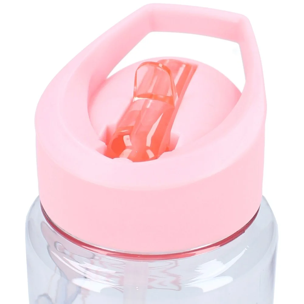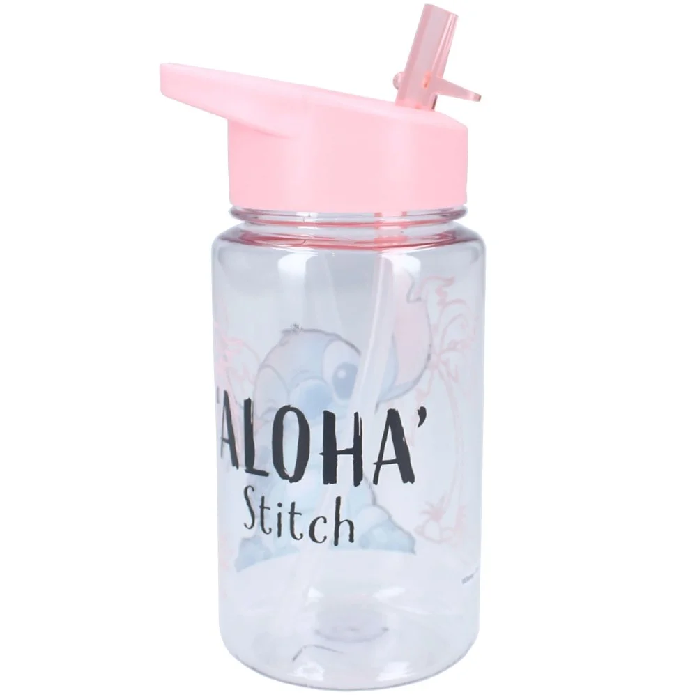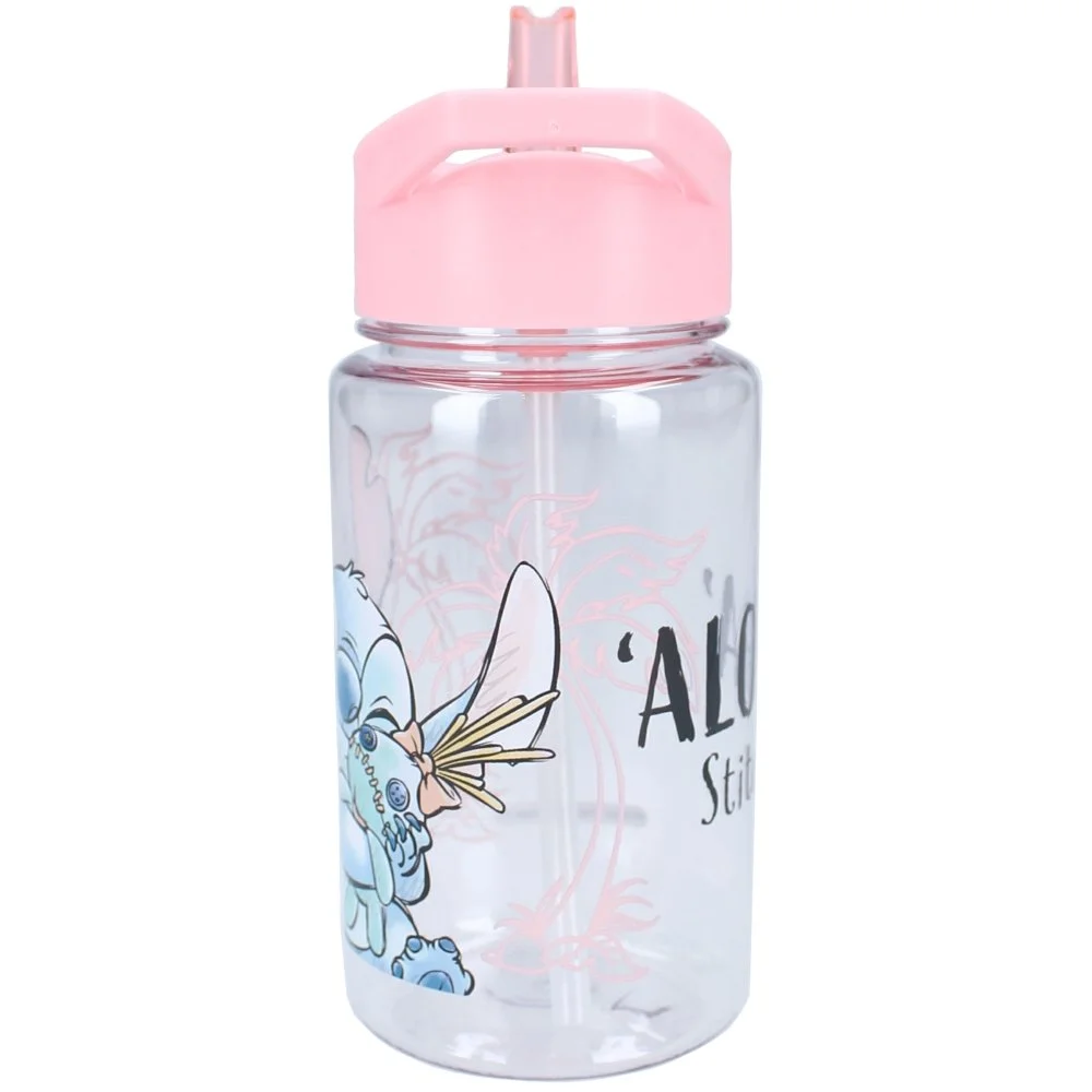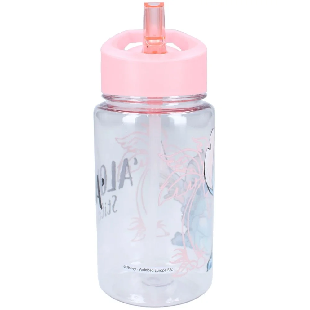 Dětská láhev na pití Lilo & Stitch s integrovaným brčkem a růžovým víčkem s ouškem pro snadné přenášení. Má objem 450 ml a je vyrobena z odolného plastu bez obsahu BPA. Vhodná pro děti od 3 let.