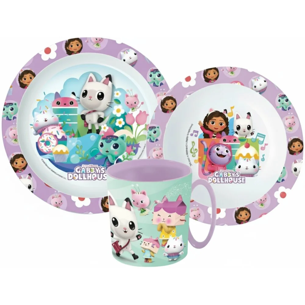 Dětská plastová jídelní sada s motivem Gabby's Dollhouse potěší všechny malé fanynky dobrodružství Gábi a její party koček. Veselý design s oblíbenými postavičkami zpříjemní každé jídlo. Sada obsahuje talířek, misku a hrneček – vše vyrobené bez obsahu BPA.
