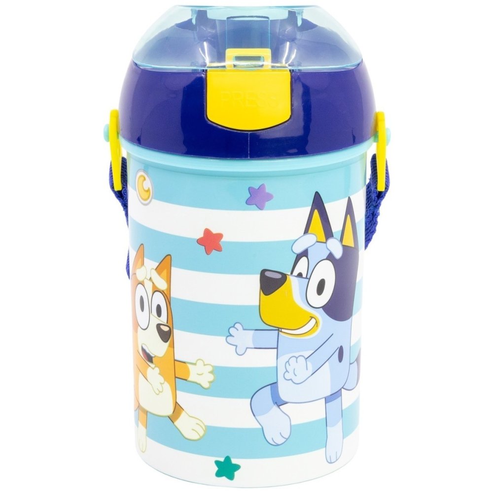 Praktická láhev s motivem psích sestřiček Bluey a Bingo. Je vyrobena z odolného plastu bez obsahu BPA. Má automatický otevírací systém s víčkem a silikonovou slámkou i textilní popruh přes rameno. S objemem 450 ml je ideálním společníkem do školky, školy i na výlety.