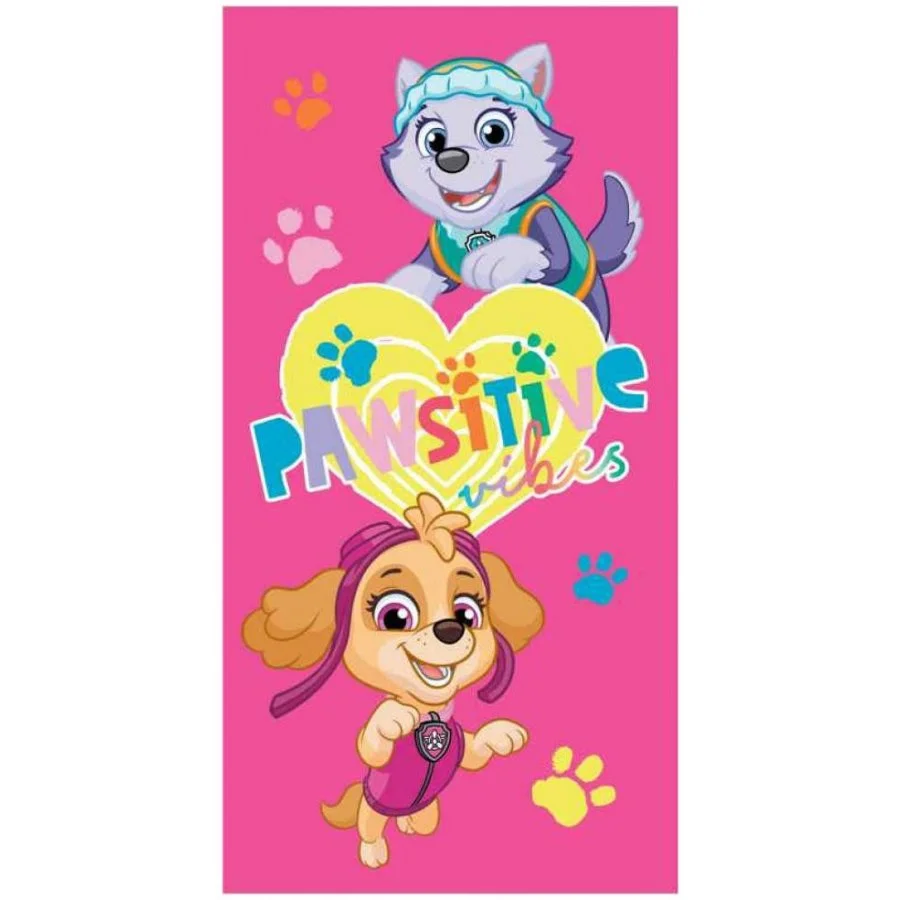 Dětská osuška Tlapková patrola - Paw Patrol - motiv PAWsitive vibes. Je vyrobená ze 100% bavlněného dobře savého froté. Zdobí ji obrázek štěňat Everest a Skye, otisky psích tlapek a uprostřed velké srdce. Je ideální nejen na doma, ale hodí se i na pláž, nebo k bazénu. Barvy této osušky jsou velice intenzivní i po mnoha vypráních. Její rozměry jsou 70 x 140 cm.