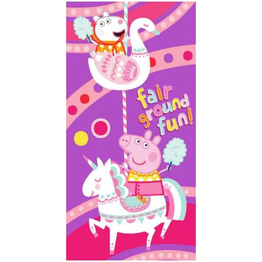 Dětská plážová osuška Prasátko Pepina na pouti. Je vyrobená ze 100% bavlněného dobře savého froté. Tato osuška je ideální do koupelny, na pláž, nebo k bazénu. Její barvy jsou velice intenzivní i po mnoha vypráních. Rozměry jsou 70 x 140 cm.