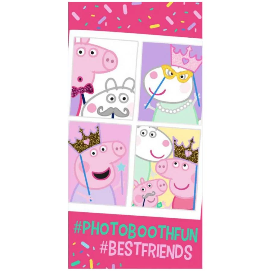 Dětská plážová osuška Prasátko Pepina. Zdobí ji sada vtipných fotografií Pepiny a jejich kamarádů pořízených ve fotokabince. Je vyrobená ze 100% bavlněného dobře savého froté. Tato osuška je ideální do koupelny, na pláž, nebo k bazénu. Její barvy jsou velice intenzivní i po mnoha vypráních. Rozměry jsou 70 x 140 cm.