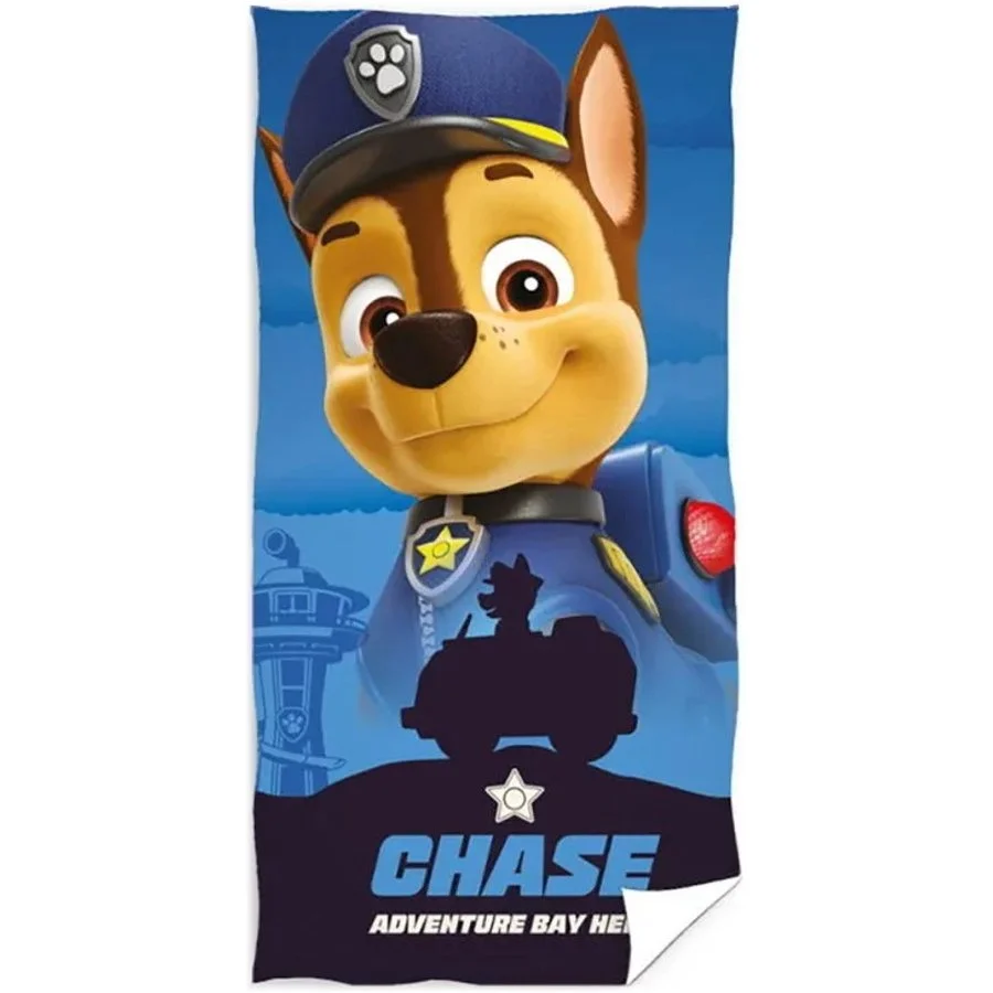 Dětská plážová osuška Paw Patrol - Tlapková patrola - motiv Policista Chase. Je vyrobená ze 100% bavlny s gramáží 300 g/m². Povrch potištěné strany osušky je velurový, druhou stranu tvoří hustě tkaná froté smyčka s vynikající savostí. Je ideální nejen doma do koupelny, ale hodí se i na pláž, nebo k bazénu. Její barvy jsou velice intenzivní i po mnoha vypráních. Rozměry této osušky jsou 70 x 140 cm.