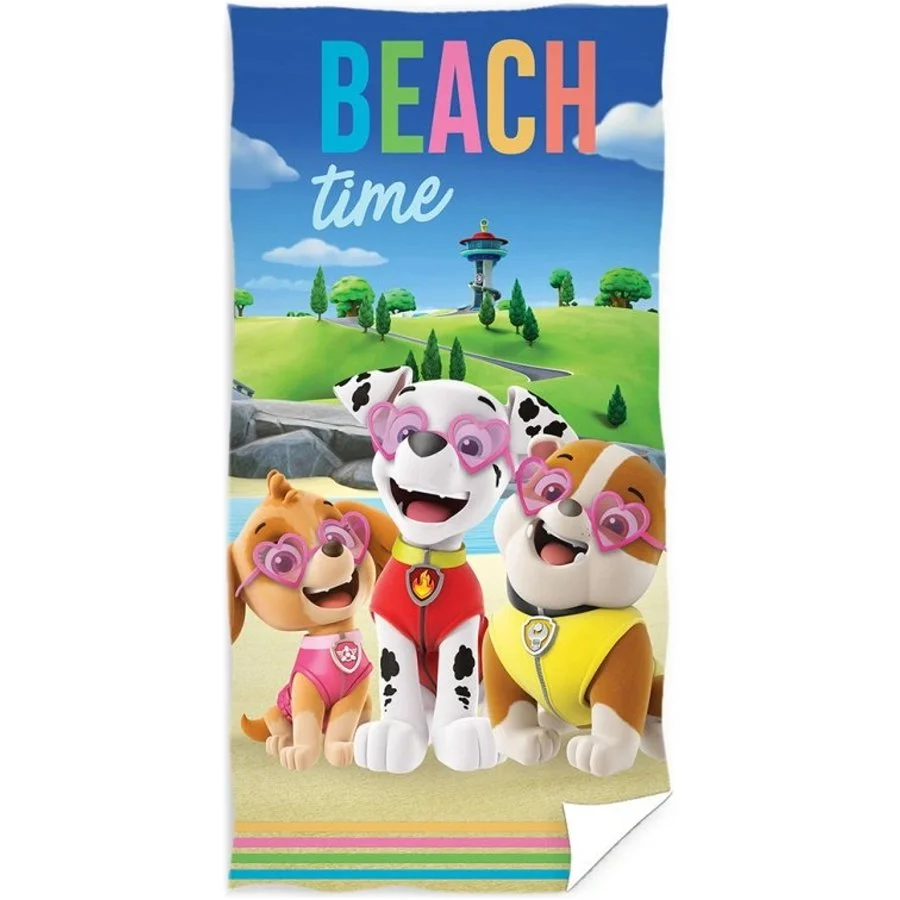 Dětská plážová osuška Paw Patrol - Tlapková patrola - motiv Beach Time. Je vyrobená ze 100% bavlny s gramáží 300 g/m². Zdobí ji obrázek party štěňat z Tlapkové patroly Skye, Marshalla a Ruble s růžovými brýlemi na písčité pláži. Povrch potištěné strany osušky je velurový, druhou stranu tvoří hustě tkaná froté smyčka s vynikající savostí. Je ideální nejen doma do koupelny, ale hodí se i na pláž, nebo k bazénu. Její barvy jsou velice intenzivní i po mnoha vypráních. Rozměry této osušky jsou 70 x 140 cm.