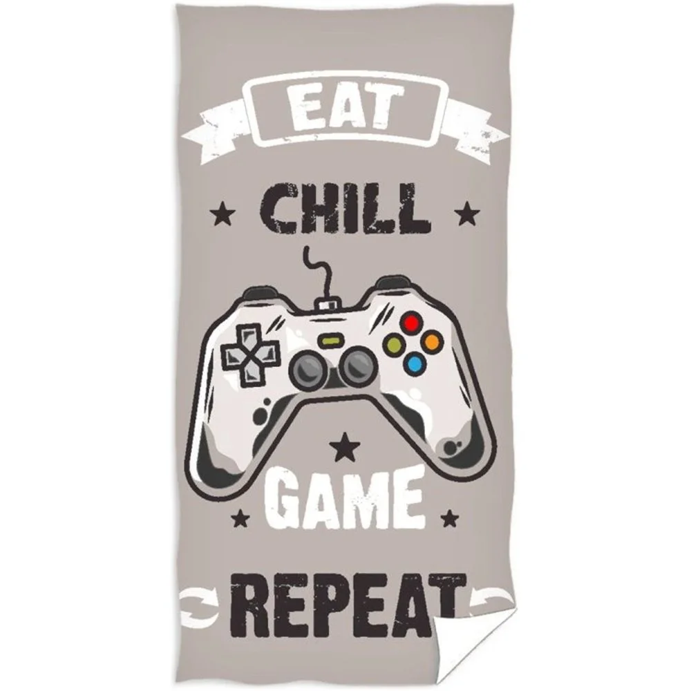 Stylová bavlněná plážová osuška s motivem Herní Flow – Eat, Chill, Game & Repeat – ideální pro každého hráče. Vyrobená ze 100% bavlny s vysokou gramáží 400 g/m² a extra velkým rozměrem 90 × 180 cm.
