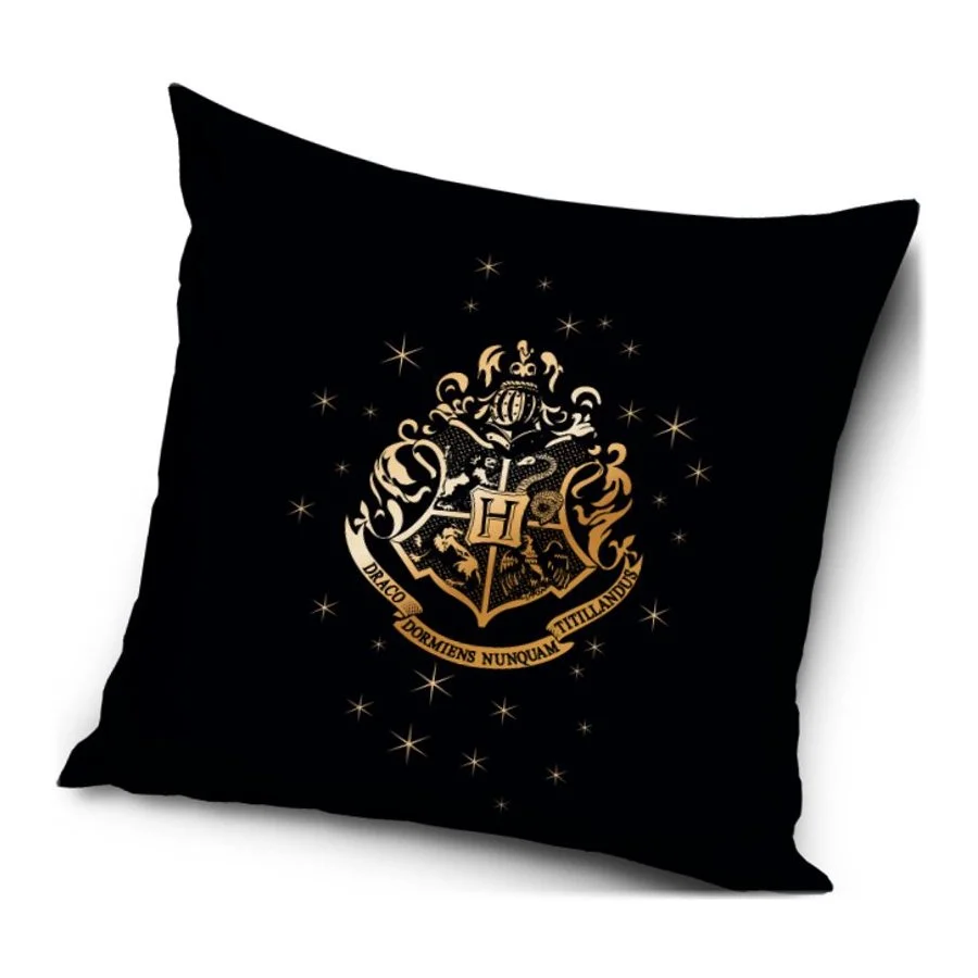Povlak na polštářek Harry Potter - motiv Zlatý erb. Tento povlak polštáře je vyroben z příjemně jemného nemačkavého materiálu a má zapínání na zip. Obě strany zdobí stejný motiv se zlatým erbem školy čar a kouzel v Bradavicích na černém podkladu.
