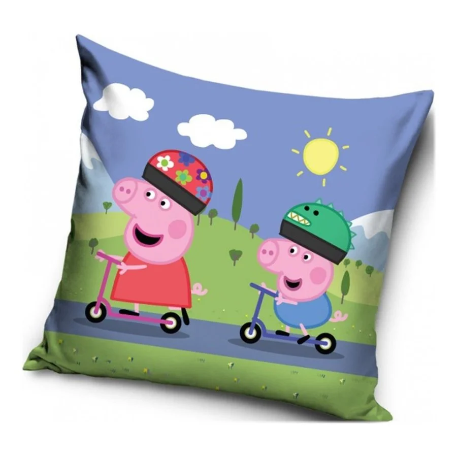 Povlak na polštářek Prasátko Peppa. Tento povlak polštáře je vyroben z příjemně jemného nemačkavého materiálu a má zapínání na zip. Obě strany zdobí stejný motiv z animovaného seriálu Prasátko Peppa s prasátkem Pepinou a Georgem, kteří jedou na výlet na koloběžkách.