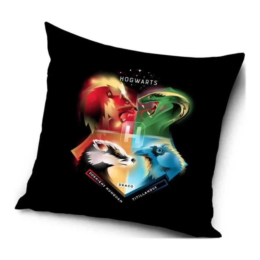 Povlečení na polštářek Harry Potter - motiv barevný erb Hogwarts. Zdobí jej magicky barevný erb školy čar a kouzel v Bradavicích na černém podkladu. Znak čarodějnické školy v Bradavicích se skládá jak jinak než ze znaků čtyř kolejí a to Nebelvíru jehož erbovním zvířetem je lev, Zmijozelu jehož erbovním zvířetem je had, Mrzimoru jehož erbovním zvířetem je jezevec a nakonec Havraspáru jehož erbovním zvířetem je orel. Tento povlak polštáře je vyroben z příjemně jemného nemačkavého materiálu a má zapínání na zip. Obě strany zdobí stejný motiv.