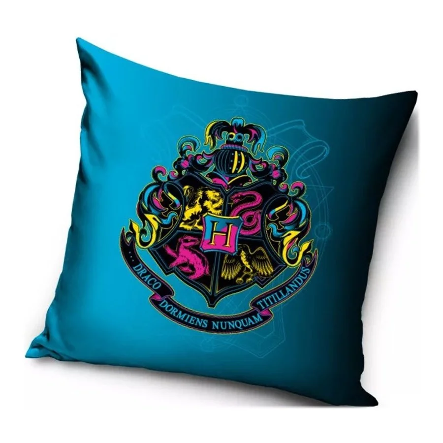 Povlečení na polštářek Harry Potter. Zdobí jej pestrobarevný erb školy čar a kouzel v Bradavicích na tyrkysovém podkladu. Znak čarodějnické školy v Bradavicích se skládá jak jinak než ze znaků čtyř kolejí a to Nebelvíru jehož erbovním zvířetem je lev, Zmijozelu jehož erbovním zvířetem je had, Mrzimoru jehož erbovním zvířetem je jezevec a nakonec Havraspáru jehož erbovním zvířetem je orel. Tento povlak polštáře je vyroben z příjemně jemného nemačkavého materiálu a má zapínání na zip. Obě strany zdobí stejný motiv.
