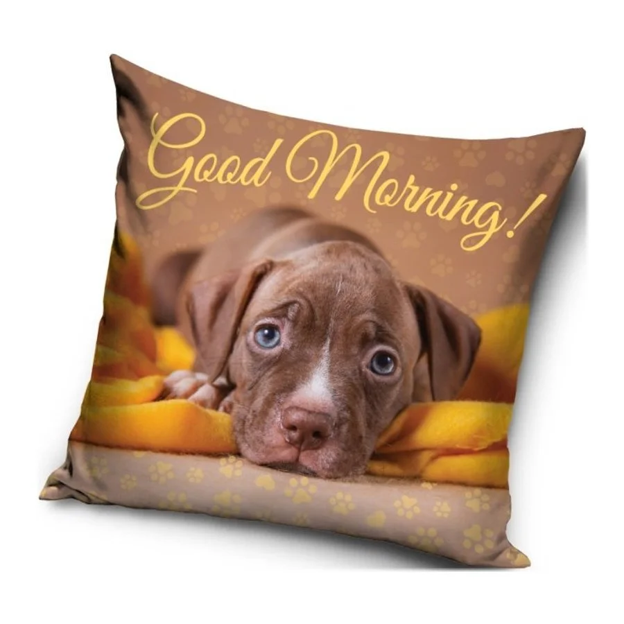 Povlak na polštářek s pejskem - motiv Good Morning!, tedy v překladu Dobré ráno! Tento povlak polštáře je vyroben z příjemně jemného nemačkavého materiálu a má zapínání na zip. Obě strany zdobí stejný motiv.