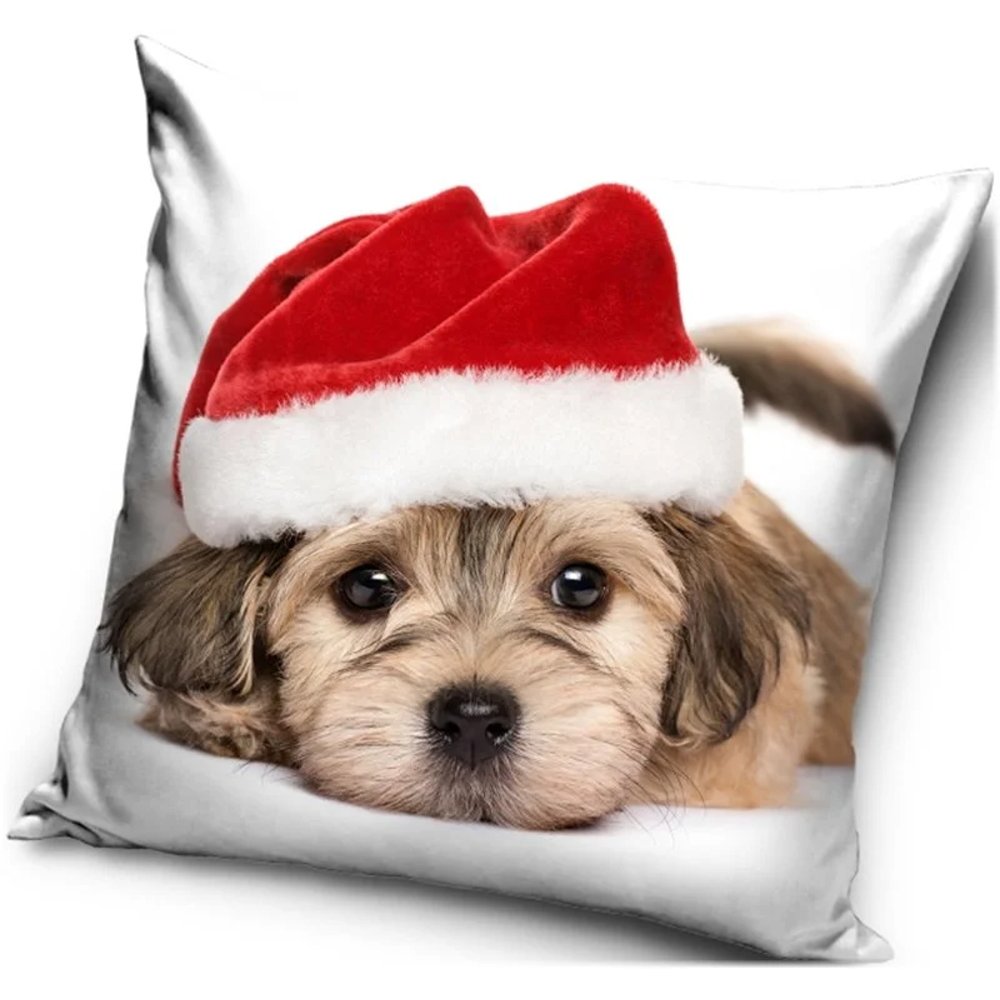 Bílý vánoční povlak na polštář se štěňátkem. Tento povlak polštáře je vyroben z příjemně jemného nemačkavého materiálu a má zapínání na zip. Obě strany zdobí stejný motiv.