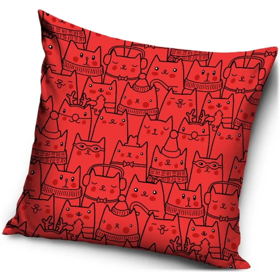 Červený povlak na polštář s motivem Kočičí sněm. Tento povlak polštáře je vyroben z příjemně jemného nemačkavého materiálu a má zapínání na zip. Obě strany zdobí stejný obrázek. Tento povlak je vhodný na polštář 40 x 40 cm. Polštářky tohoto rozměru naleznete také v naší nabídce.