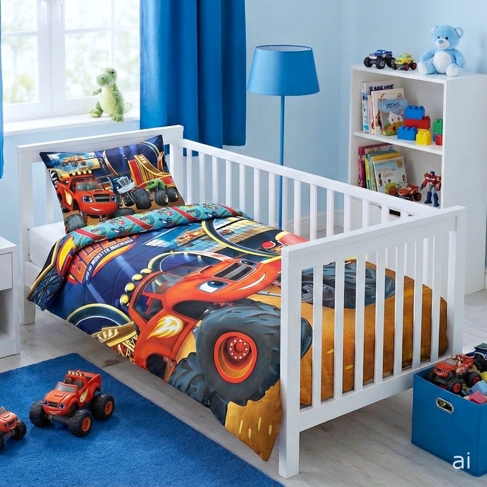 Ložní povlečení Blaze and the Monster Machines do malé dětské postýlky nebo kolébky. Zdobí ho obrázek monster trucku Plamínka a jeho řidiče AJ v závodní aréně. Souprava obsahuje povlak na přikrývku 100x135 cm a povlak na polštář 40x60 cm.