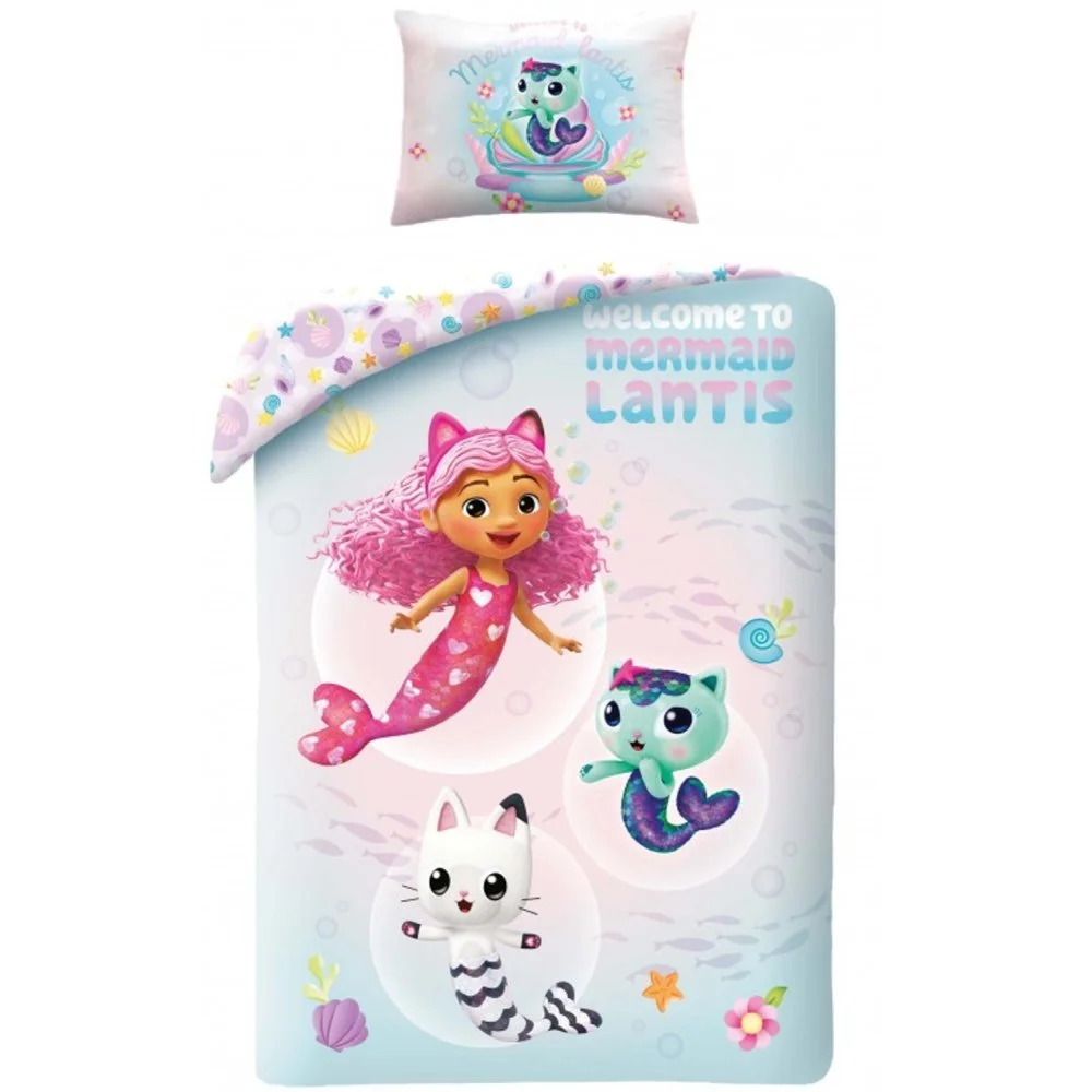 Ložní povlečení Gabby's Dollhouse do malé dětské postýlky vyrobené z jemné 100% bavlny. Motiv Gábinky a jejích kočičích kamarádek v podobě mořských panen potěší všechny malé fanynky této pohádkové série. Rozměry přikrývky jsou 100x135 cm a polštáře 40x60 cm.