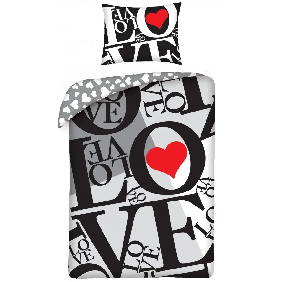 Bavlněné ložní povlečení ♡ LOVE ♡ pro všechny zamilované. Toto oboustranné povlečení je vyrobeno ze 100% bavlny se zapínáním na zip. Přední stranu povlaku přikrývky zdobí nápisy LOVE a červené srdíčko. Ve stejném duchu je navržen i povlak polštáře z obou stran. Zadní strana povlečení na peřinu je poseta srdíčky na šedém podkladu. Tato souprava ložního povlečení obsahuje 1x povlak na přikrývku 140 x 200 cm a 1x povlak na polštář 70 x 90 cm. Je ideální jako dárek pro všechny zamilované, např. ke svátku sv. Valentýna, nebo jednoduše do ložnice jakéhokoliv zamilovaného páru.