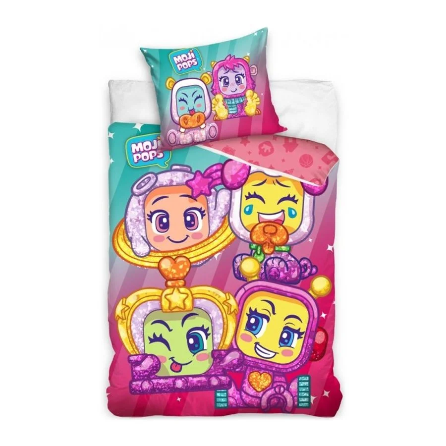 Dětské ložní povlečení Moji Pops vyrobené v licenci MagicBox Toys. Toto oboustranné povlečení je vyrobeno ze 100% bavlny se zapínáním na zip. Na přední straně povlaku přikrývky je jen zlomek z mnoha barevných figurek z druhé série Moji Pops. Na zadní straně povlaku na peřinu jsou symboly vlastností Moji Pops na růžovém podkladu. Povlak polštáře je z obou stran stejný se dvěma Moji Pops na růžovo tyrkysovém podkladu. Tato souprava ložního povlečení obsahuje 1x povlak na přikrývku 140 x 200 cm a 1x povlak na polštář 70 x 90 cm.