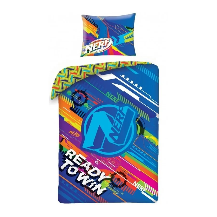 Ložní povlečení NERF. Toto oboustranné povlečení je vyrobeno ze 100% bavlny se zapínáním na zip. Přední stranu povlečení na peřinu zdobí logo NERF, tedy logo oblíbené značky dětských plastových pistolí a zbraní na pěnovou munici od firmy Hasbro. Na zadní straně povlaku přikrývky jsou obrázky pěnových nábojů NERF na zeleném podkladu. Povlak polštáře je z obou stran stejný. Tato souprava ložního povlečení obsahuje 1x povlak na přikrývku 140 x 200 cm a 1x povlak na polštář 70 x 90 cm.