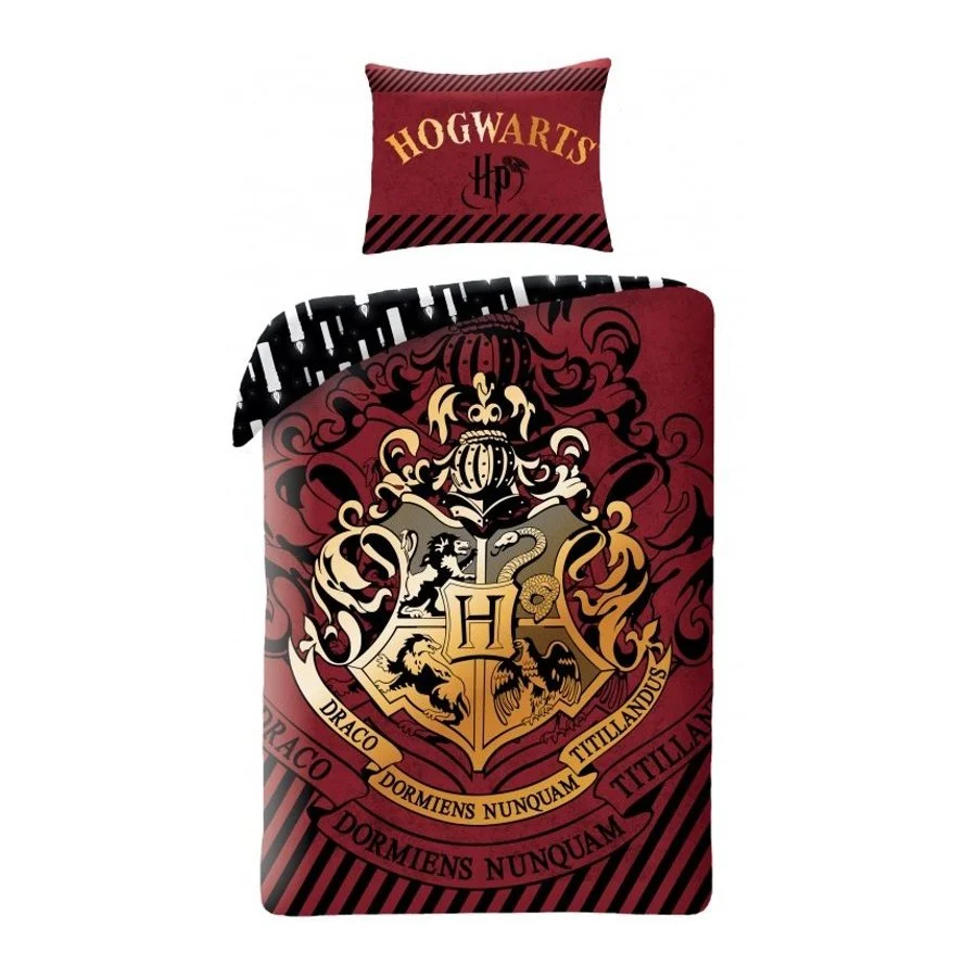 Ložní povlečení Harry Potter - zlatý erb Hogwarts. Je vyrobeno ze 100% bavlny se zapínáním na zip. Přední straně povlečení na peřinu dominuje zlatý erb školy čar a kouzel v Bradavicích na červenohnědém podkladu. Znak čarodějnické školy v Bradavicích se skládá jak jinak než ze znaků čtyř kolejí a to Nebelvíru, Zmijozelu, Mrzimoru a Havraspáru. Druhá strana povlaku přikrývky je černá se siluetami hořících svíček. Povlak polštáře je z obou stran stejný. Tato souprava ložního povlečení obsahuje 1x povlak na přikrývku 140 x 200 cm a 1x povlak na polštář 70 x 90 cm.