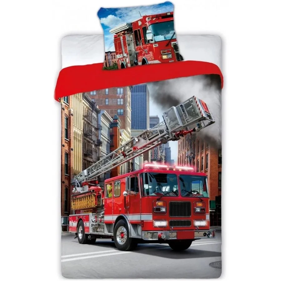 Souprava ložního povlečení - motiv velké hasičské auto turbo 4x4. Toto oboustranné povlečení je vyrobeno ze 100% bavlny. Na přední straně povlaku přikrývky je fototisk hasičského auta, které staví dlouhý žebřík k zásahu. Hasičské auto se složeným žebříkem zdobí i polštář. Zadní strana je jednobarevná červená. Tato souprava ložního povlečení obsahuje 1x povlak na přikrývku 140 x 200 cm a 1x povlak na polštář 70 x 90 cm.