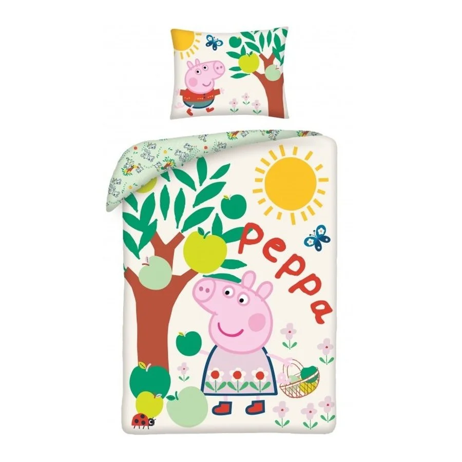 Dětské ložní povlečení Prasátko Peppa a jablka. Toto oboustranné povlečení je vyrobeno ze 100% bavlny se zapínáním na zip. Přední stranu povlečení na peřinu zdobí obrázek Prasátka Peppiny, která sbírá jablka do košíčku. Na zadní straně povlaku přikrývky jsou podobné obrázky i s malým Tomíkem a taky obrázky Peppiny s Tomíkem na výletě na kole, to vše na mentolově zeleném podkladu. Povlak polštáře je z obou stran stejný. Tato souprava ložního povlečení obsahuje 1x povlak na přikrývku 140 x 200 cm a 1x povlak na polštář 70 x 90 cm.
