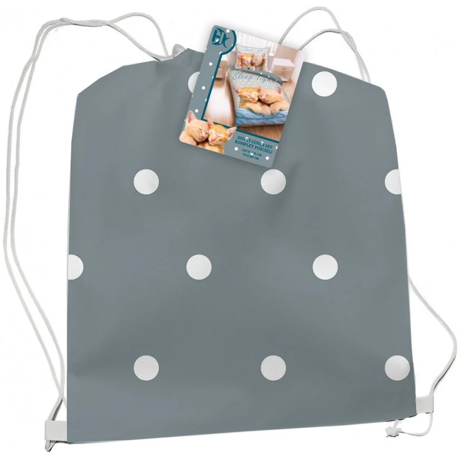 BONUS • Toto povlečení je zabaleno v bavlněné tašce se šňůrkami vyrobené ze stejné látky jako je rubová strana povlečení, tedy šedý sáček s bílými puntíky. Tuto tašku pak můžete využít jako vak na záda, nebo sáček na cokoliv.