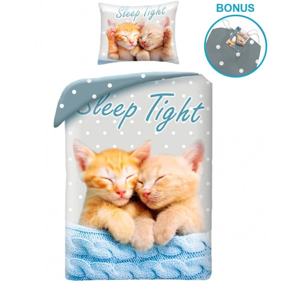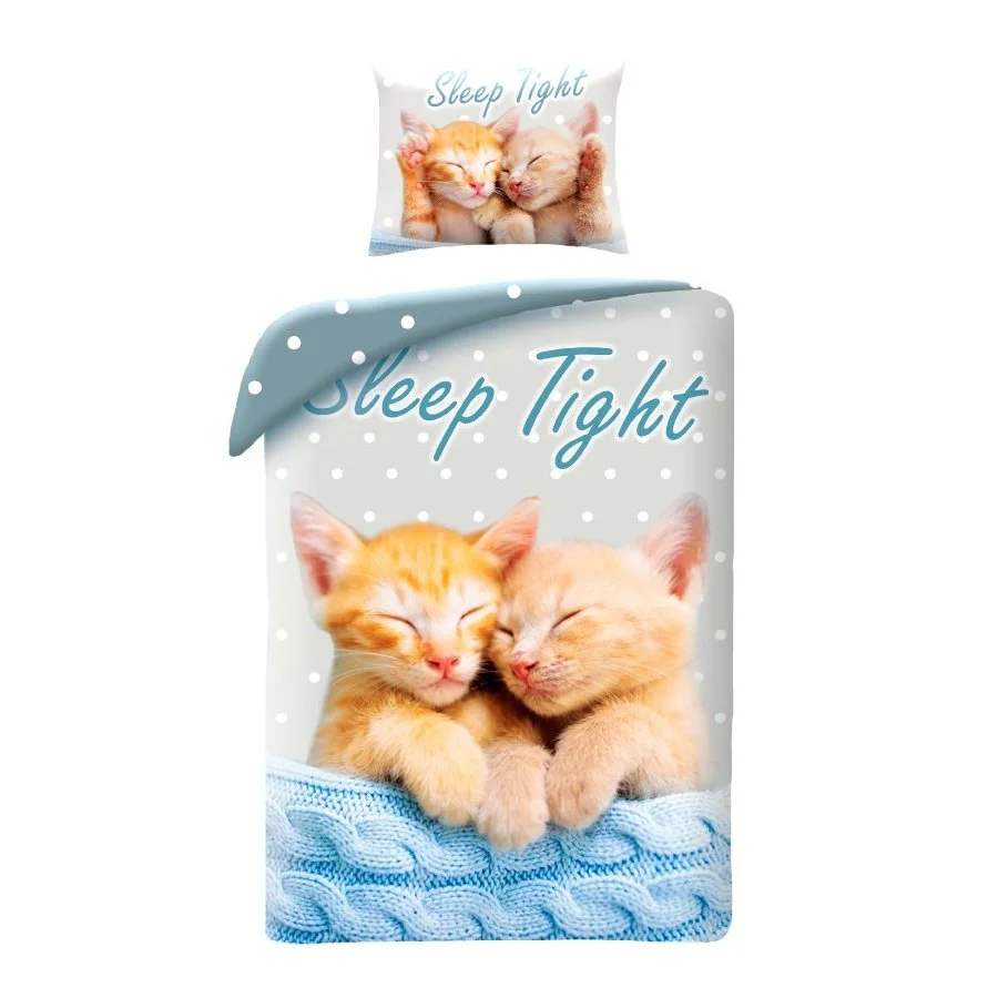 Souprava ložního povlečení se zrzavými koťátky. Toto oboustranné povlečení je vyrobeno ze 100% bavlny se zapínáním na zip. Přední stranu povlaku přikrývky zdobí obrázek dvou zrzavých koťátek, které přitulené k sobě odpočívají. Na druhé straně povlečení na peřinu jsou bílé puntíky na šedém podkladu. Povlak polštáře je z obou stran stejný a jsou na něm opět tulící koťátka. Tato souprava ložního povlečení s obsahuje 1x povlak na přikrývku 140 x 200 cm a 1x povlak na polštář 70 x 90 cm.