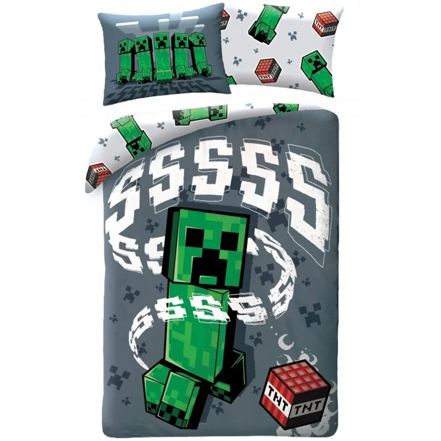 Oboustranné ložní povlečení Minecraft - motiv Creeper. Licenční povlečení vyrobené ze 100% bavlny se zapínáním na zip. Na lícní straně povlaku na peřinu je obrázek Creepera a blok s výbušninou TNT. Chrakteristický zvuk syčení naznačuje, že brzy dojde k výbuchu. Na povlaku polštáře je Creeperů pět. Druhá strana povlečení na přikrývku i na polštář má stejný motiv s Creepery a TNT, ale na bílém podkladu. Tato souprava ložního povlečení Minecraft obsahuje 1x povlak na přikrývku 140 x 200 cm a 1x povlak na polštář 70 x 90 cm.