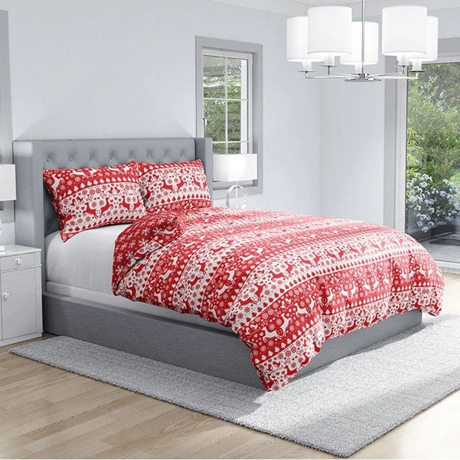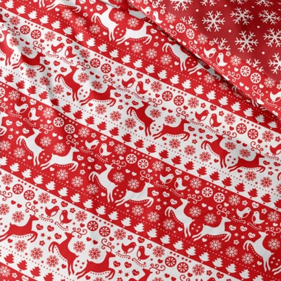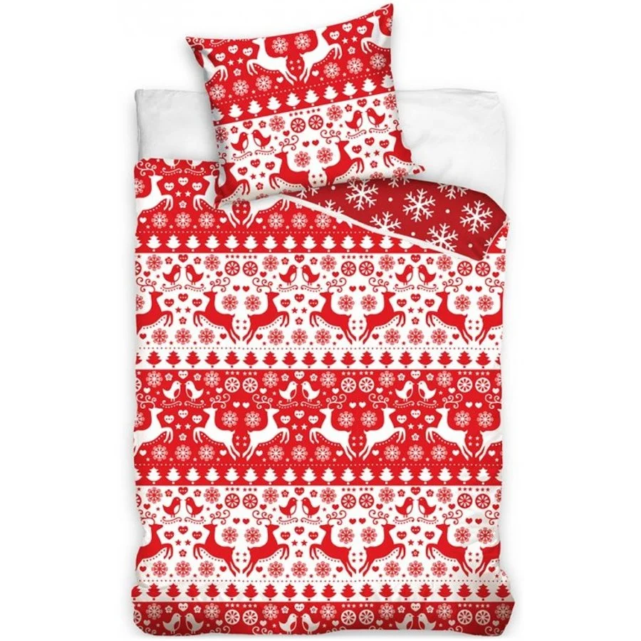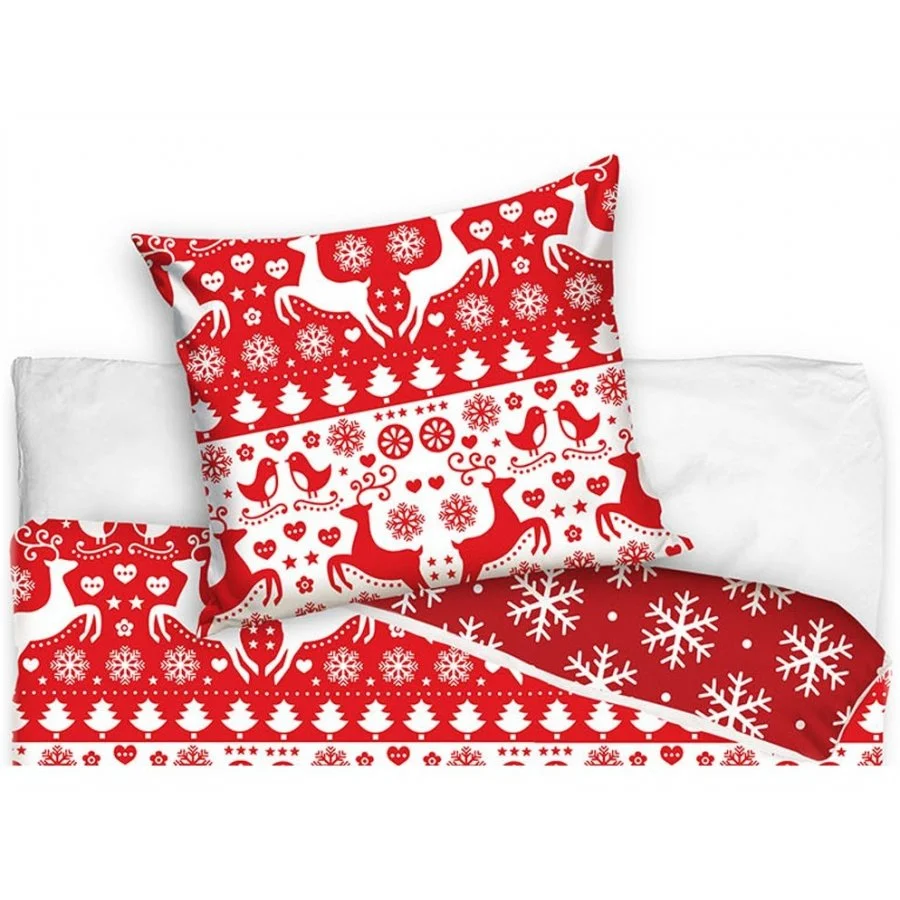 Vánoční souprava ložního povlečení - motiv Vánoční poezie. Toto oboustranné povlečení je vyrobeno ze 100% bavlny prémiové kvality Renforce se zapínáním na zip. Lícní stranu povlaku přikrývky zdobí motiv se spoustou sobů. stromků, vloček a srdíček v červeno bílém provedení. Druhá strana povlečení na peřinu je červená s bílými sněhovými vločkami. Povlak polštáře je z obou stran stejný. Tato souprava ložního povlečení obsahuje 1x povlak na přikrývku 140 x 200 cm a 1x povlak na polštář 70 x 90 cm (poslední ilustrační obrázek je povlečení ve francouzském rozměru na jednu přikrývku 200 x 220 cm, které ovšem nemáme v nabídce).