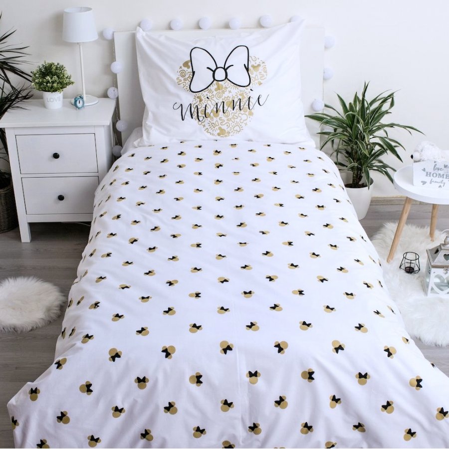 Ložní souprava Disney - Minnie Mouse - potištěné unikátní zlatou barvou. Toto oboustranné povlečení je vyrobeno ze 100% bavlny se zapínáním na zip. Přední stranu povlečení na peřinu zdobí silueta hlavy myšky Minnie s velkou zlatou mašlí. Podobný motiv mají i obě strany povlaku polštáře, jen potisk je zlatý a mašle bílá. Zadní strana povlaku přikrývky je bílá s geometrickým vzorem složeným ze zlatých siluet hlavy myšky Minnie. Tato souprava licenčního povlečení Disney obsahuje 1x povlak na přikrývku 140 x 200 cm a 1x povlak na polštář 70 x 90 cm.