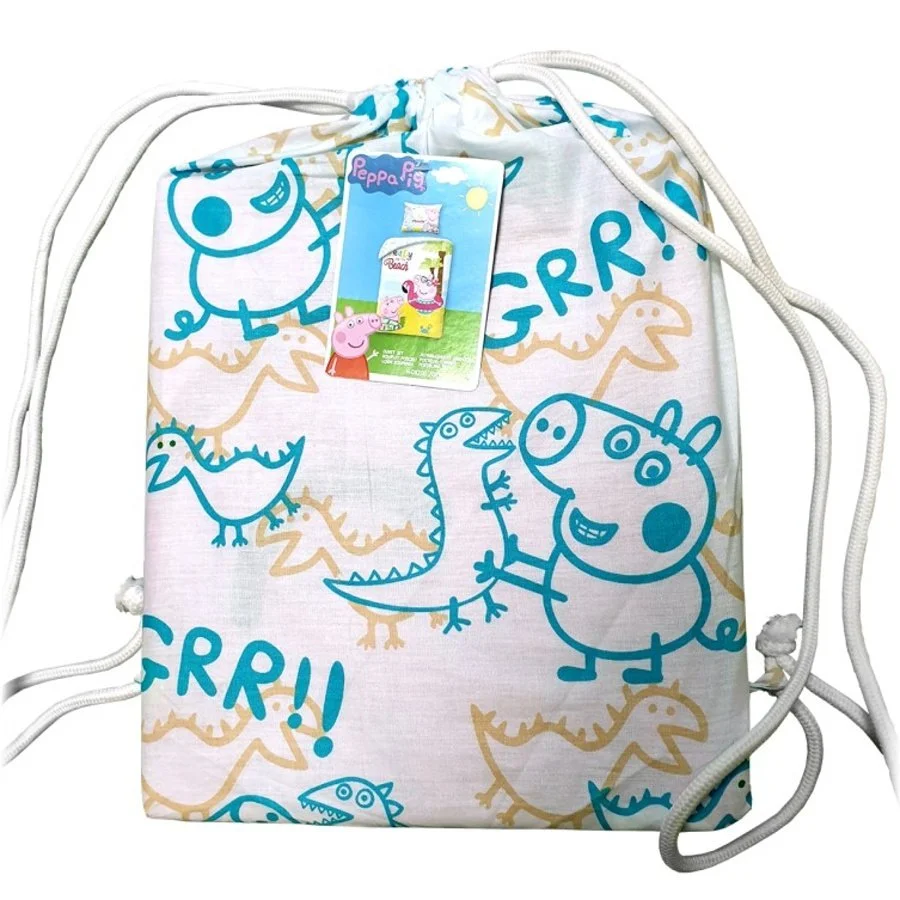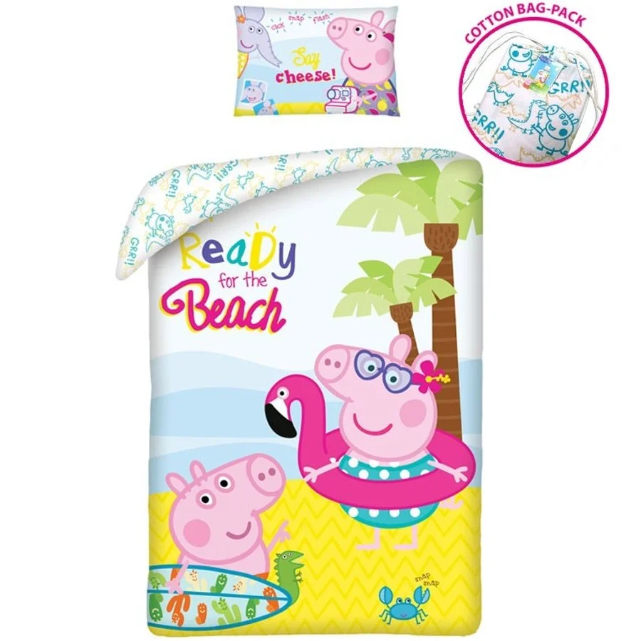 Dětské ložní povlečení Prasátko Peppa - motiv Ready for The Beach. Toto oboustranné povlečení je vyrobeno ze 100% bavlny se zapínáním na zip. Lícní stranu povlečení na peřinu zdobí obrázek Prasátka Peppiny s plavacím kruhem a George s malým surfem na pláži. Na druhé straně povlaku přikrývky jsou siluety prasátek a dinosaurů na bílém podkladu. Povlak polštáře je z obou stran stejný. Tato souprava ložního povlečení obsahuje 1x povlak na přikrývku 140 x 200 cm a 1x povlak na polštář 70 x 90 cm.