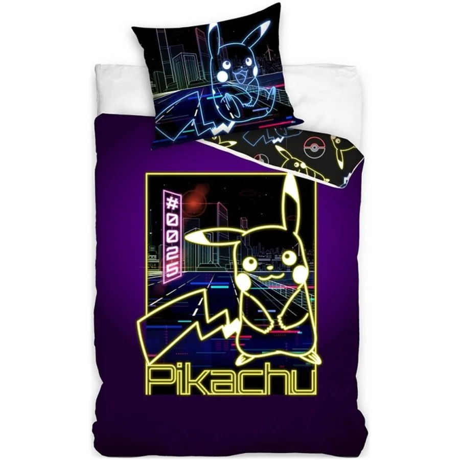 Ložní souprava Pokémon Pikachu. Toto oboustranné povlečení je vyrobeno ze 100% bavlny Renforcé se zapínáním na zip a s efektem, díky kterému ve tmě světélkuje, pokud jej přes den nasvítíte denním světlem. Tento efekt se bohužel cca po 5 vypráních začne vytrácet. Na lícní straně povlaku na přikrývku je obrys asi nejznámějšího Pokémona Pikachu na pozadí neónového města. Právě obrys tohoto Pokémona ve tmě světélkuje. Povlak polštáře má podobný motiv, ale bez svítícího efektu. Rubová strana povlaku na peřinu je černá s neónovými obrysy Pokémonů a pokéballů. Tato souprava ložního povlečení obsahuje 1x povlak na přikrývku 140 x 200 cm a 1x povlak na polštář 70 x 90 cm.