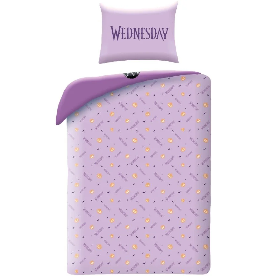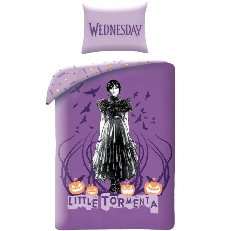 Souprava ložního povlečení Wednesday - motiv Little Tormenta. Na lícní straně povlaku na přikrývku je obrázek temné a sarkastické dívky Wednesday Addams s hejnem krkavců na fialovém pozadí, zatímco druhá strana je světle fialová s drobnými nápisy "Wednesday", siluetami krkavců a halloweenskými dýněmi. Povlak na polštář je z obou stran zdoben nápisem "Wednesday" na jemně fialkovém podkladu.