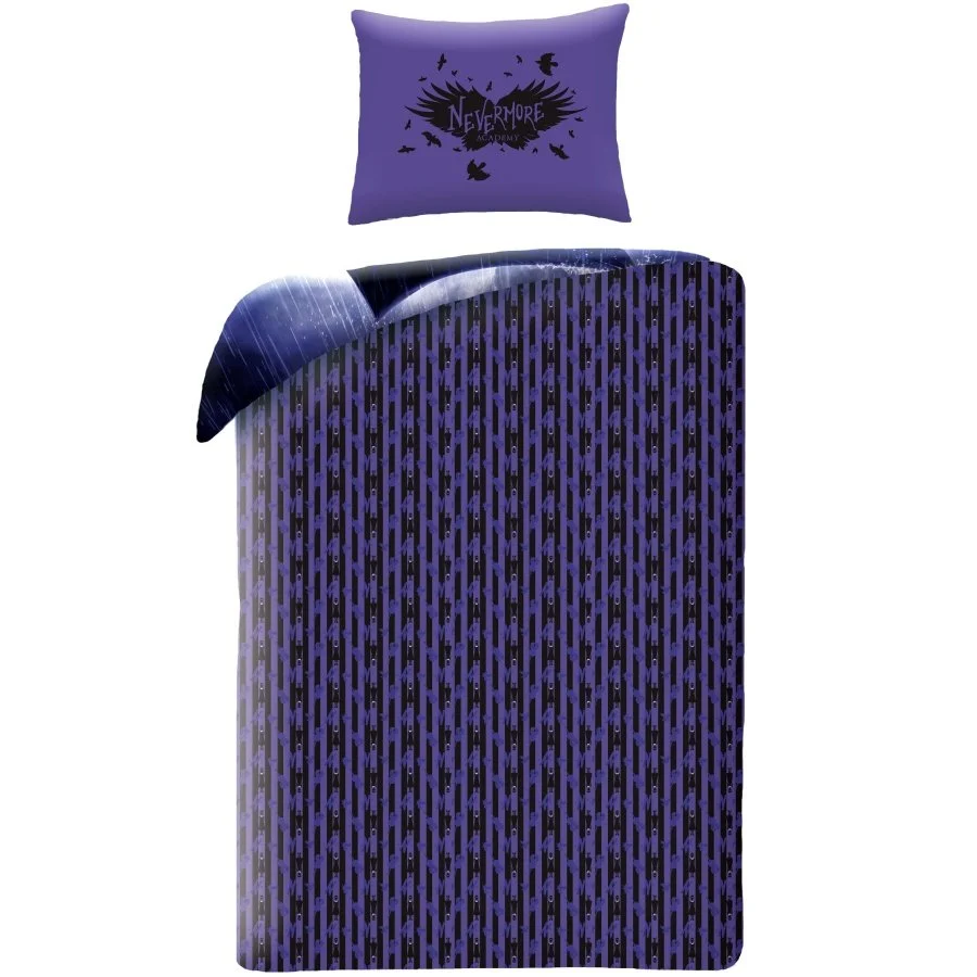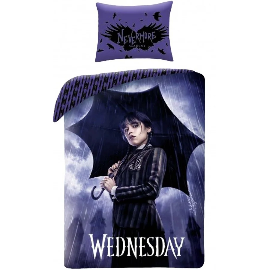 Souprava ložního povlečení Wednesday. Na lícní straně povlaku na přikrývku je obrázek temné a sarkastické dívky Wednesday Addams s deštníkem v prudkém lijáku. Druhá strana povlaku je tmavě fialová s drobnými siluetami Wednesday a symboly z této hororové mystery komedie. Na obou stranách povlaku polštáře je motiv s krkavčími křídly a nápis "Nevermore Academy".